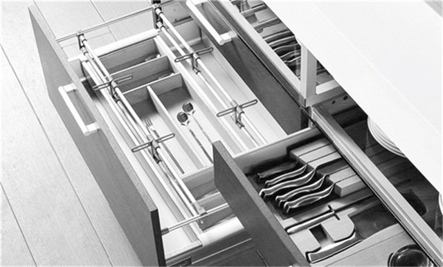 3、隔架的安裝。家居柜體一般都有抽屜設計,為不影響使用,設計抽屜的位置時要注意:做三扇推拉門時應避開兩門相交處;做兩扇推拉門時應置于一扇門體一側;做折疊門時抽屜距側壁應有17cm空隙。