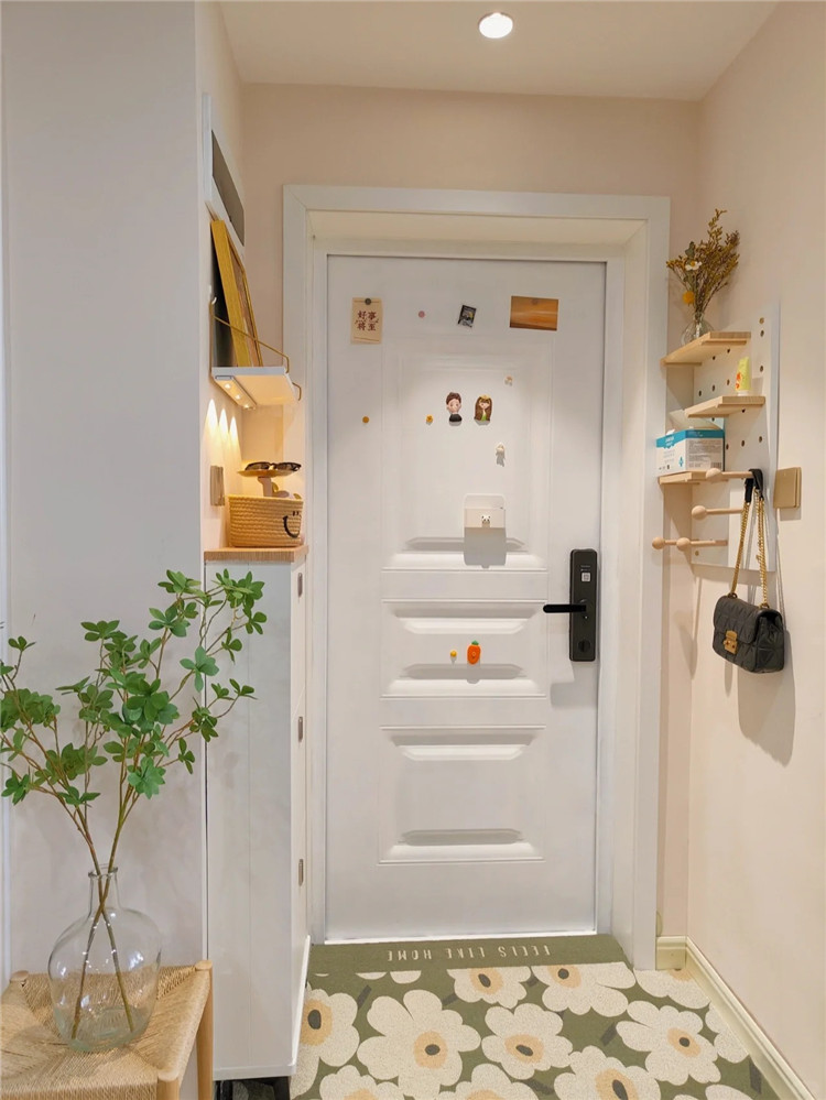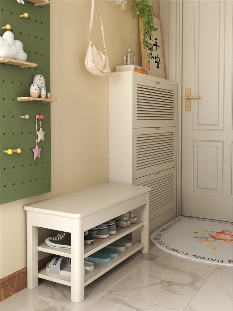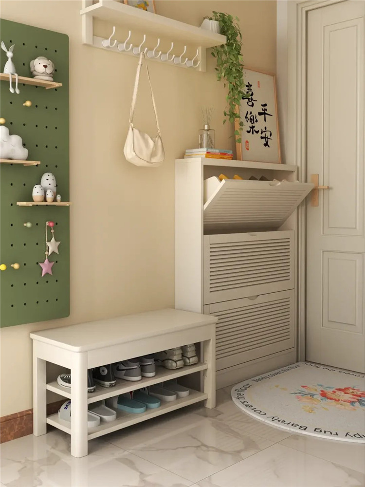 對于鞋柜上方,可以安裝上洞洞板,洞洞板不占空間,布局更靈活,可用來裝飾,也可以掛一些小物件。