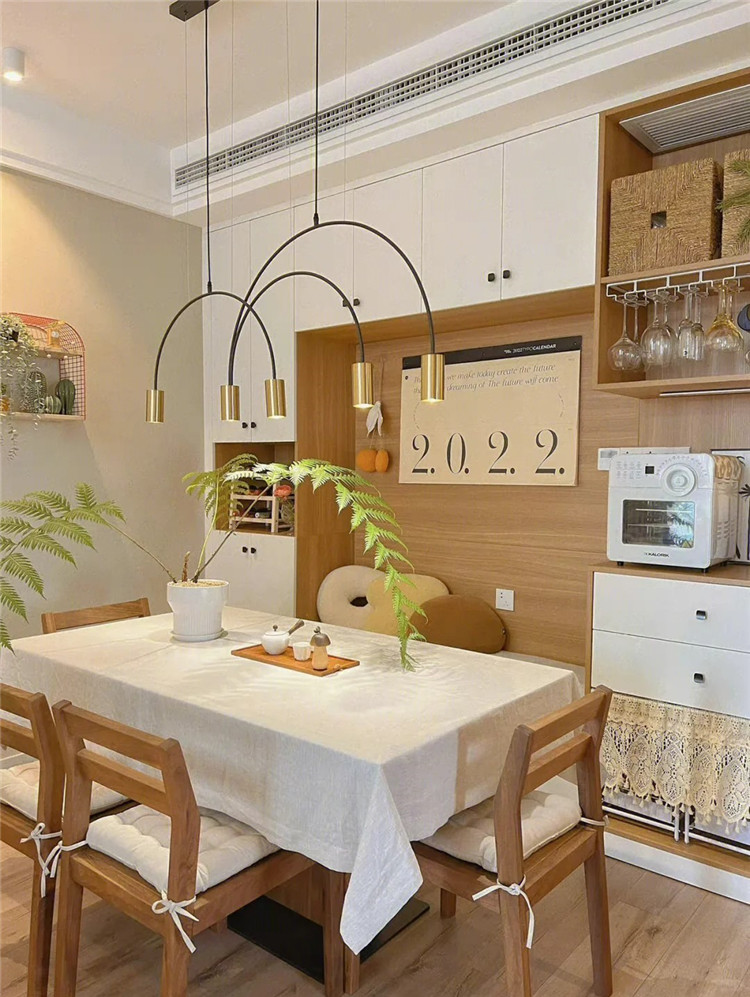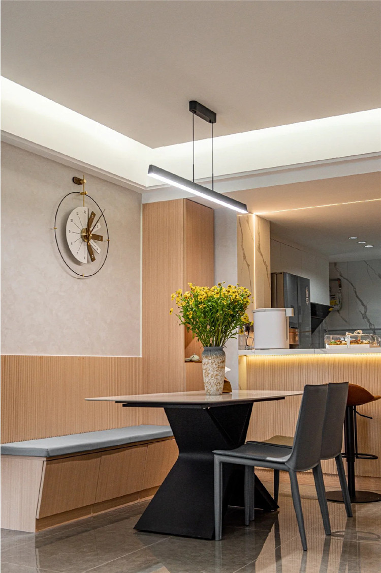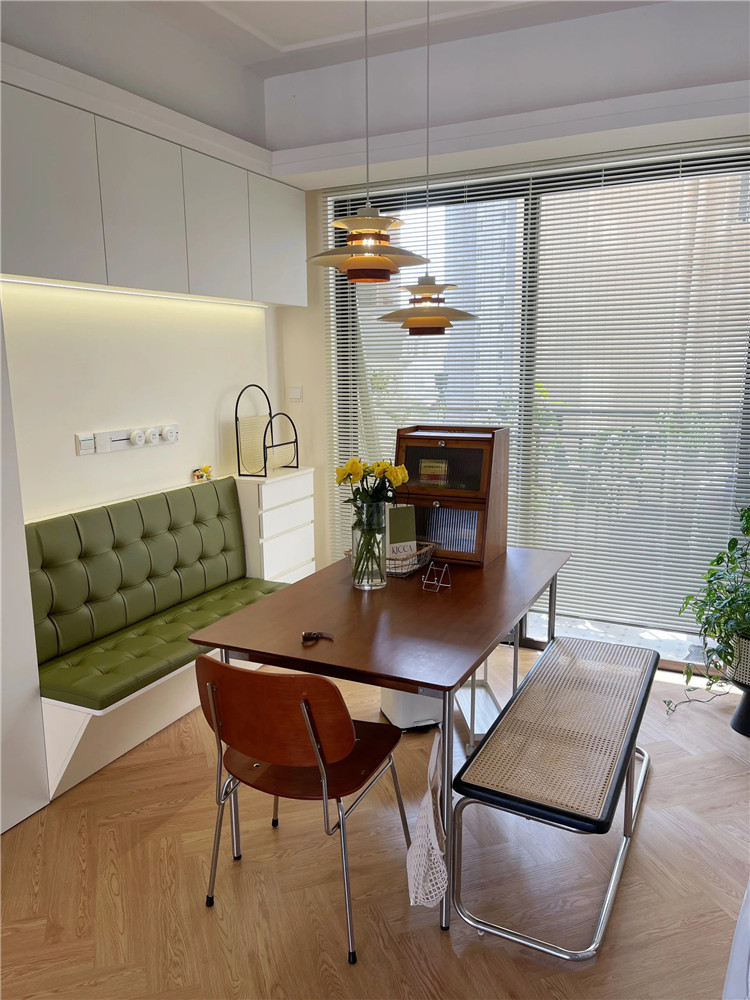 對于這種情況,完全可以將餐邊柜與卡座結合,實用不占空間。常見的卡座設計,會把卡座內部留空,當做儲物柜使用。