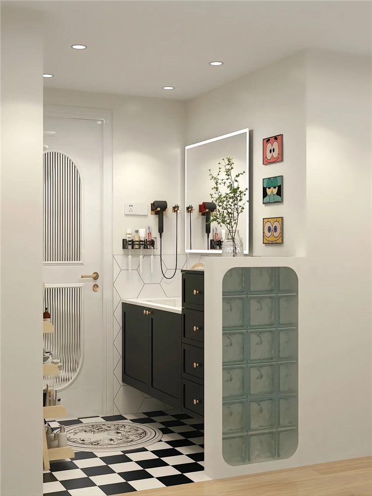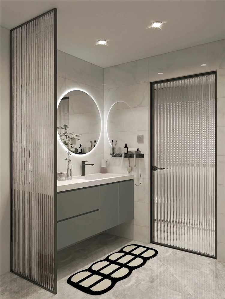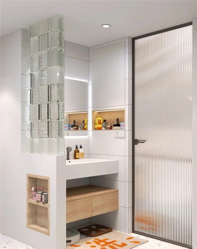 外置洗手臺可以采用半墻的設計,然后在半墻上加上美觀的玻璃屏風或木質隔斷,既保護了隱私,又不會擔心洗手臺區域雜亂不美觀。