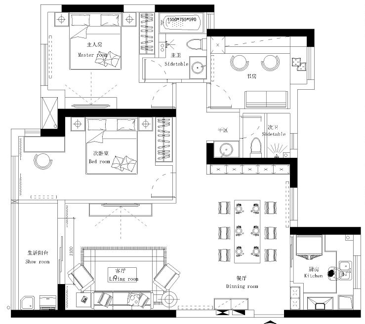 世茂錦繡長江的這套150㎡的四居室主宰整體格局呈現一個大正方形,因此在規劃設計上不適合將動靜區域完全分隔開,而設計師則利用將就餐區域作為家居中心點,臥室、廚房、客廳則圍繞就餐區域展開進行設計,有效提升空間利用率的同時有效提升了空間結構的層次感與豐富感??臻g整體軟裝則以暖黃色為主基調色,與簡歐風相契合,強調溫和典雅氛圍。