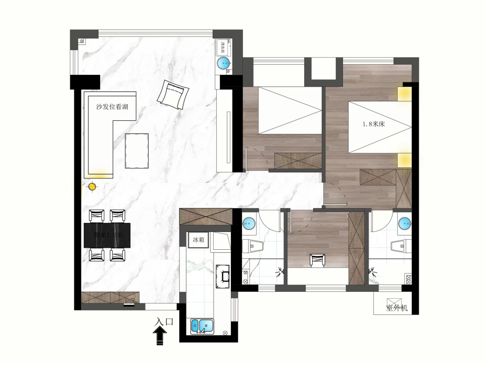 1 將主衛納入主臥,并設置L型衣柜,補充收納,形成一個功能齊全、舒適便捷的私人空間。