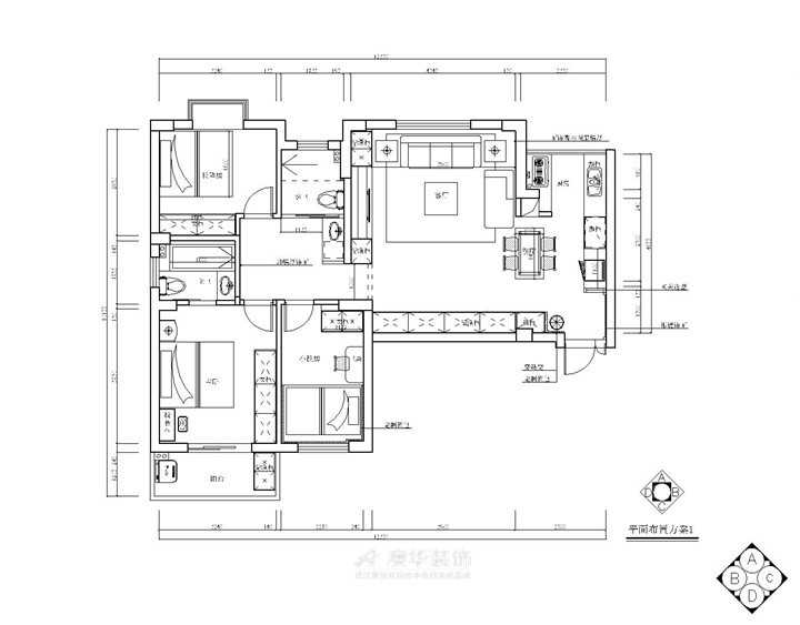 濱江軍苑這套三居室房屋面積約為130㎡,屬于大戶型房屋,整體戶型結構較為平整且南北通透,因此設計師在進行規劃設計的時候充分的利用了戶型結構的優勢,將室外光線引入室內,有效提升了整個家居空間的采光度。而由于客廳區域相對比較狹長,因此被劃分出一塊區域改造為就餐區域,以讓空間格局的視覺效果更加協調。