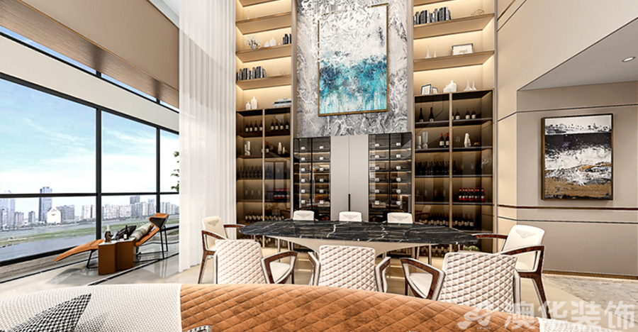 巖板的電視背景墻扶搖而上,彰顯大氣風范。電視內嵌其中,邊側以金屬線條進行勾勒,造型簡單用材精致,低調中呈現出輕奢的貴氣質感。 邊側內嵌酒柜,與餐廳酒柜相呼應,金屬色的橫豎交織條不僅使整個空間 更加有層次,突顯沉穩品味。
