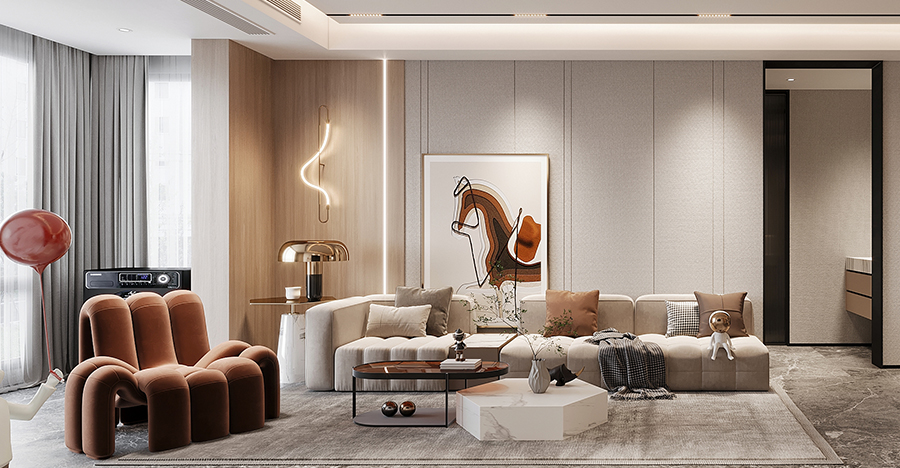 由天地壁三個面向來陳述運用垂直水平幾何線條電視墻,機能整合與建筑概念的導入掌握空間的特質與需求