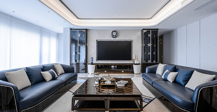 客廳全部采用無主燈設計,摒棄傳統布局,以茶幾為中心環繞三面進口皮沙發,盡顯金 主爸爸唯我獨尊的尊貴氣質。