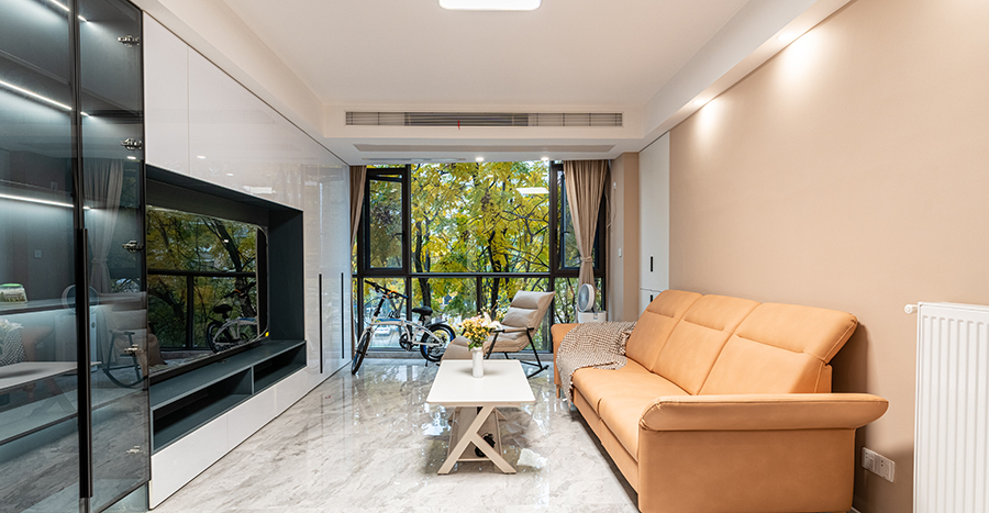 越純粹、簡約、質樸的色調,越能貼合內心希冀的溫柔。沙發背景選用淡雅的莫蘭迪色系,營造出豐富細膩的視覺觀感,搭配暖色系皮質沙發,為空間注入舒適與溫馨的居住體驗。角落嵌入白色儲物柜,進一步豐盈空間層次,實現顏值與功能兼顧。
